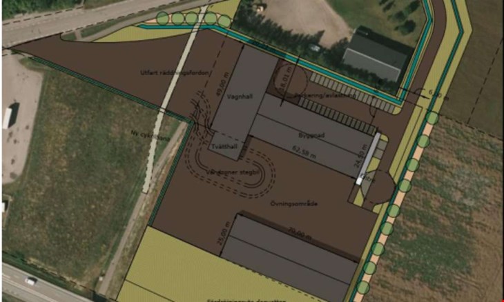 Illustrationsplanen visar hur den nya brandstationen ska kunna inrymma garage för räddningstjänstens fordon, personalutrymmen samt övningsområde.