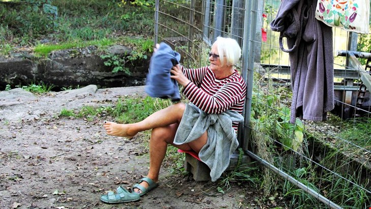 Sju nigningar senare plus några extra för att badet skulle fångas på bild, kliver hon smidigt upp för kanten. Utan att jäkta torkar hon sig och byter om till sin höst/vårbadrock.