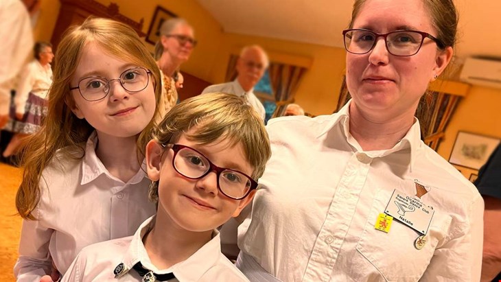 Två personer sticker verkligen ut bland alla rejält vuxna på dansgolvet. David och Jenny Strand. Han nio, hon tolv. Och med sig har de även mamma Natalie, morbror Peter som ikväll är caller, morfar Gustav och vid sidan av dansgolvet sitter gammelmorfar Verner.