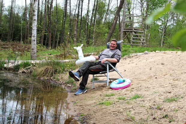 Vi tar oss förbi hästhagen och Kim nämner att döttrarna och sambon ville ha häst. Han stod för stängslet och sköter helgens utfodring, bara han slipper gå nära dem. Lite längre fram har han skapat sig en sandstrand vid dammen som räknas som en nyfunnen hobby. Aktuellt projekt är att bygga en bro över till stugan, som han köpt och renoverat, och så ska stenbumlingar ner i vattnet för att höja trivseln.